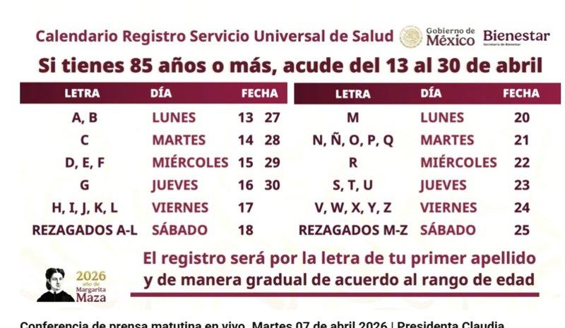 En conferencia mañanera, detalló que el registro será del 13 al 30 de abril solo para adultos mayores de 85 años y también se registrará a quien en ese momento los acompañe.