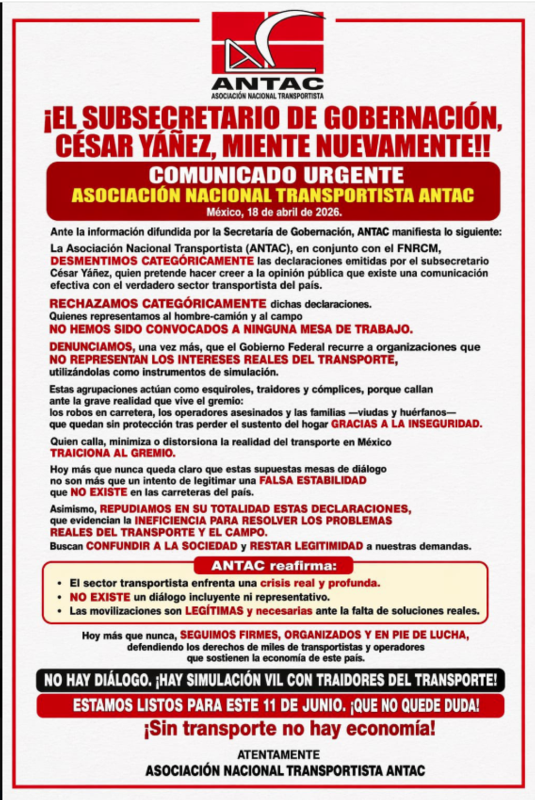 El subsecretario de Gobernación César Yáñez miente al asegurar que existe dialógo y acuerdos, acusó la Asociación Nacional de Transportistas (ANTAC), en un desplegado publicado en el que advierte de próximas movilizaciones el próximo 11 junio.