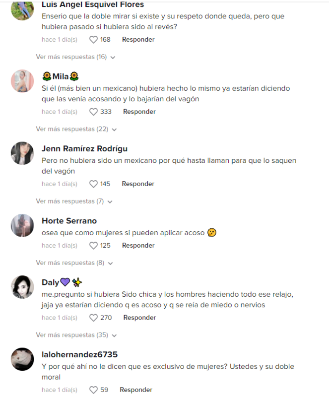 Los internautas reprueban que sean mujeres, quienes generalmente son víctimas de acoso sexual en el Metro, las que hacen comentarios que se podrían considerar como acoso sexual como: “La manoseada va gratis… Va calado, va probado”, lo cual visiblemente incomoda y molesta al viajero, pese a que sonríe y se deja detener por una usuaria.