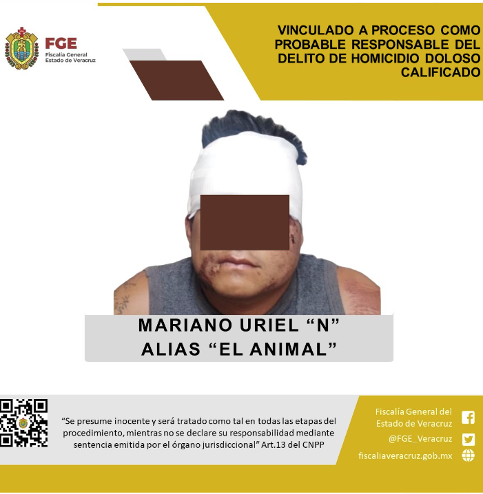 La Fiscalía General del Estado informa que Mariano Uriel “N” alias “El Animal” fue vinculado a proceso como probable responsable del delito de homicidio doloso calificado.