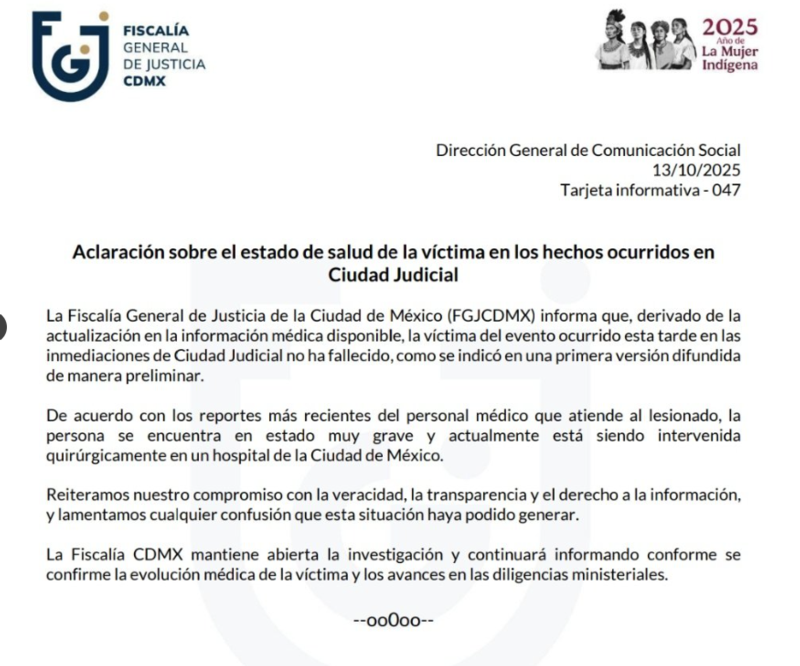"La Fiscalía General de Justicia de la Ciudad de México (FGJCDMX) informa que, derivado de la actualización en la información médica disponible, la víctima del evento ocurrido esta tarde en las inmediaciones de Ciudad Judicial no ha fallecido, como se indicó en una primera versión difundida de manera preliminar.