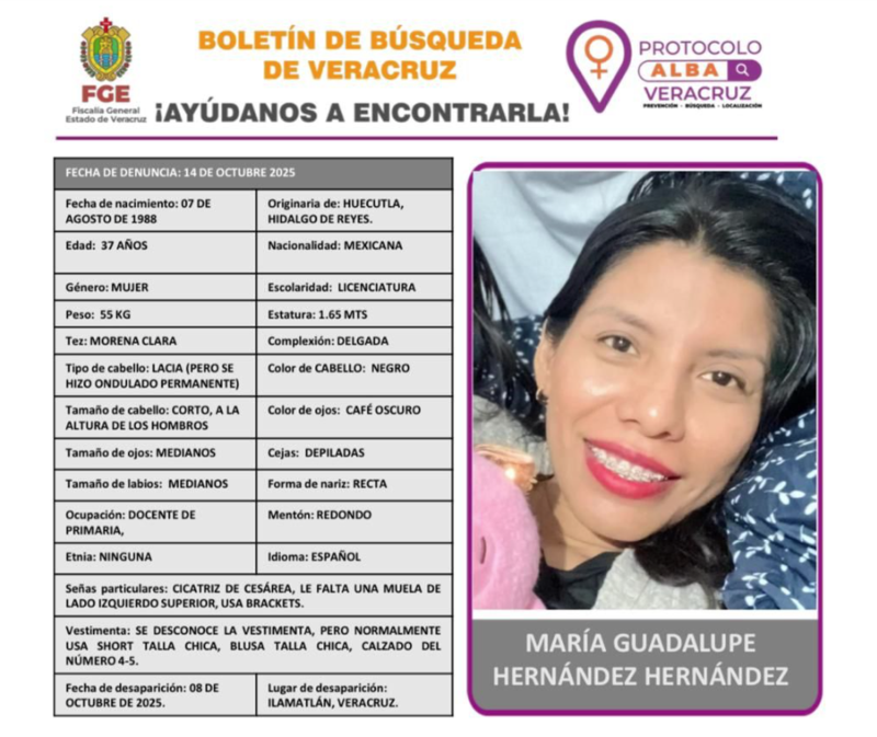 Xalapa, Ver.- El mecanismo para la localización de mujeres con reporte de extravío Protocolo Alba Veracruz publicó las fichas de la profesora María Guadalupe Hernández Hernández y su menor hija Allison Guadalupe Morales Hernández, en la noche del martes 14 octubre.