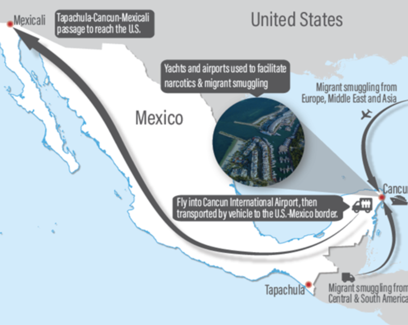 Según el Tesoro, la Bhardwaj HSO utiliza yates, marinas y hoteles en Cancún para recibir a los migrantes antes de trasladarlos hacia la frontera norte, en colaboración con la organización Hernández Salas, también sancionada en 2023.
