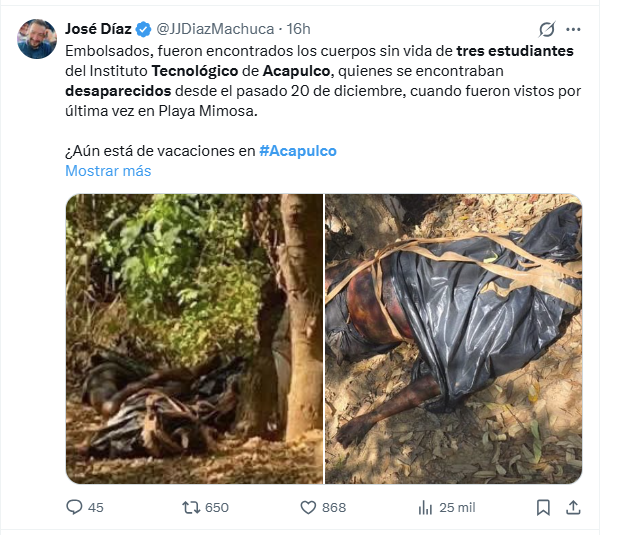 ??LOCALIZAN SIN VIDA A TRES ESTUDIANTES DEL TECNOLÓGICO DE #ACAPULCO REPORTADOS COMO DESAPARECIDOS EL 20 DE DICIEMBRE.