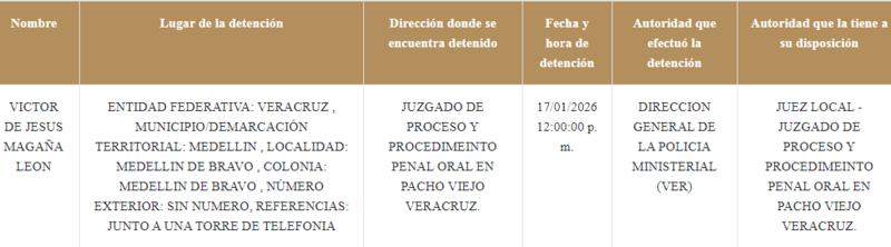 Asimismo, la SSPC detalla que Víctor “N” fue puesto a disposición de un juzgado de proceso y procedimiento penal, con sede en Pacho Viejo, Veracruz.
