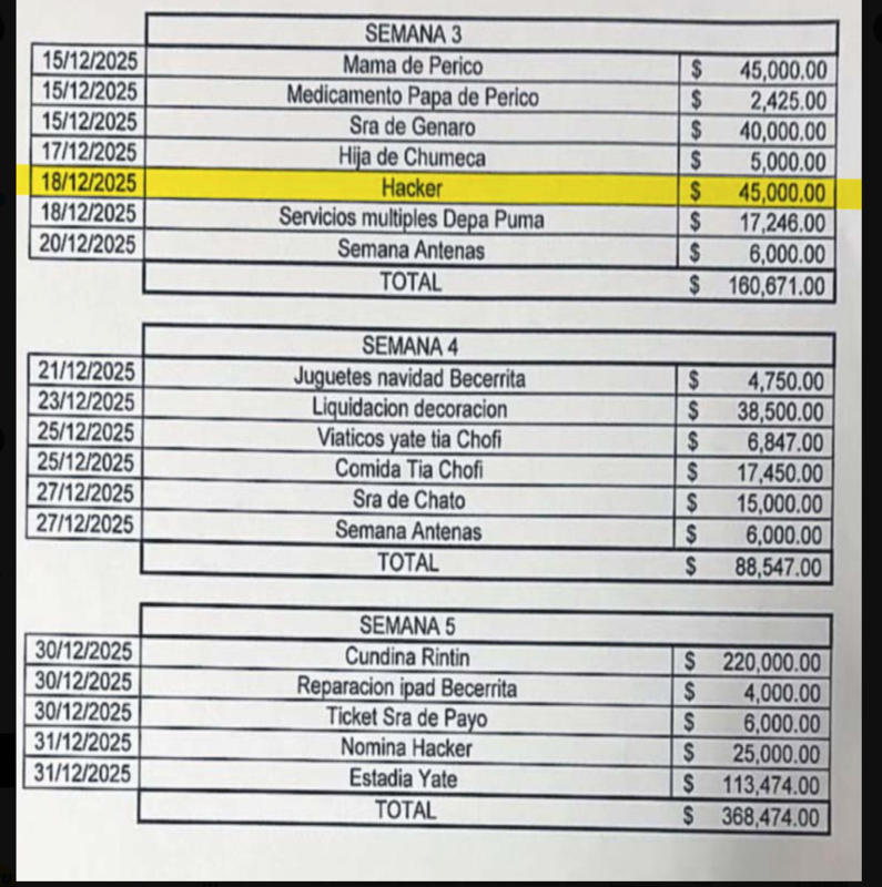 Y es que detalla pagos por 630 mil pesos a siete piratas informáticos para vulnerar sistemas financieros y de dependencias de seguridad.