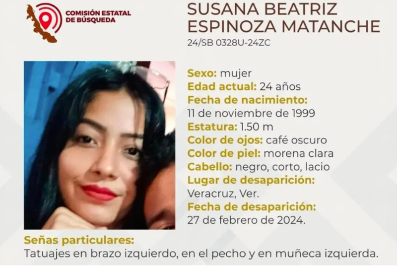 Susana Beatriz Espinoza Matanche fue encontrada muerta el 14 de marzo del 2024, luego de que sus familiares exigieran su localización y realizaran protestas y bloqueos de calles. Sus restos fueron localizados en un pequeño barranco en el fraccionamiento Río Medio 3.