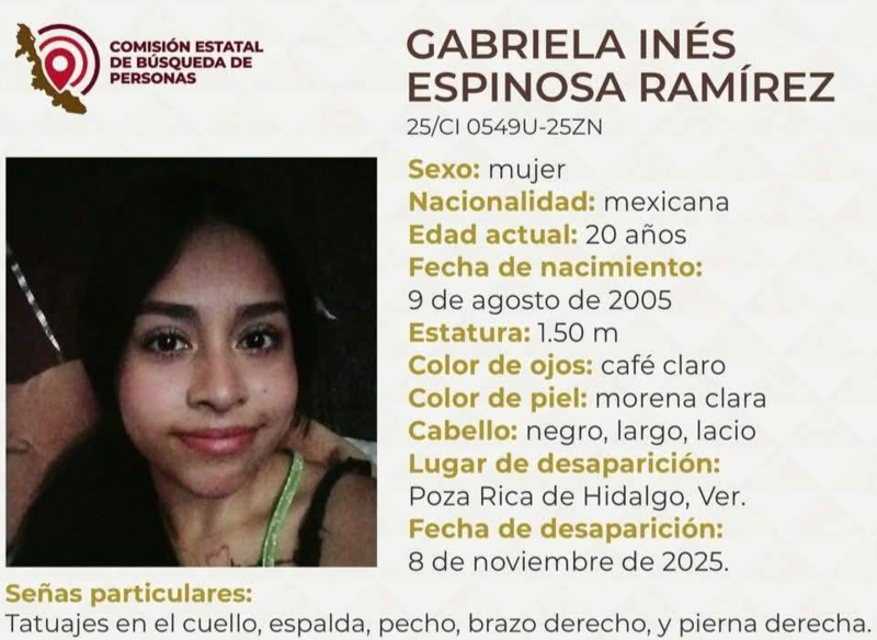 A través de sus redes sociales, el organismo dio a conocer que la joven de 20 años, quien fue reportada desaparecida desde el 8 de noviembre de 2025, en el municipio Poza Rica, había sido “Localizada”, acompañada de un moño negro, en señal de luto.