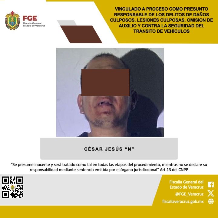 Lla Fiscalía General del Estado, a través de la Fiscalía Regional Veracruz, informa que logró la vinculación a proceso en contra de César Jesús “N”, señalado por su presunta responsabilidad en los delitos de daños culposos, lesiones culposas, omisión de auxilio y contra la seguridad del tránsito de vehículos.