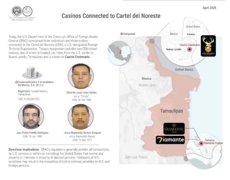 El Departamento del Tesoro de Estados Unidos, a través de Oficina de Control de Activos Extranjeros, sancionó a seis personas vinculadas a una red de lavado de dinero y contrabando de efectivo del Cártel del Noreste, a través de casinos.
