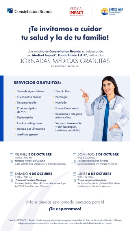 Constellation Brands, en colaboración con Medical Impact y Fondo Unido I.A.P., llevará a cabo del 3 al 6 de octubre una jornada médica gratuita en Veracruz, con el objetivo de acercar servicios de salud a la comunidad y fomentar el bienestar de las familias.