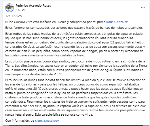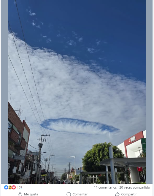Fue captada una impresionante nube la mañana de este miércoles de las conocidas como “CAVUM”; fue vista en Puebla, informó el meteorólogo Federico Acevedo. Detalló que estos fenómenos son causados por aviones que pasan a través de bancos de nubes altocúmulos.