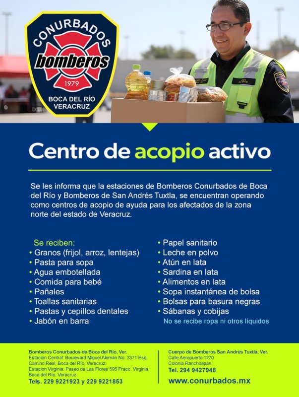 En entrevista para XEU Noticias, Omar Armas dio a conocer que uno de los centros de acopio se encuentra en las instalaciones de Bomberos Conurbados, en frente del tianguis ubicado en el bulevar Miguel Alemán de Boca del Río.