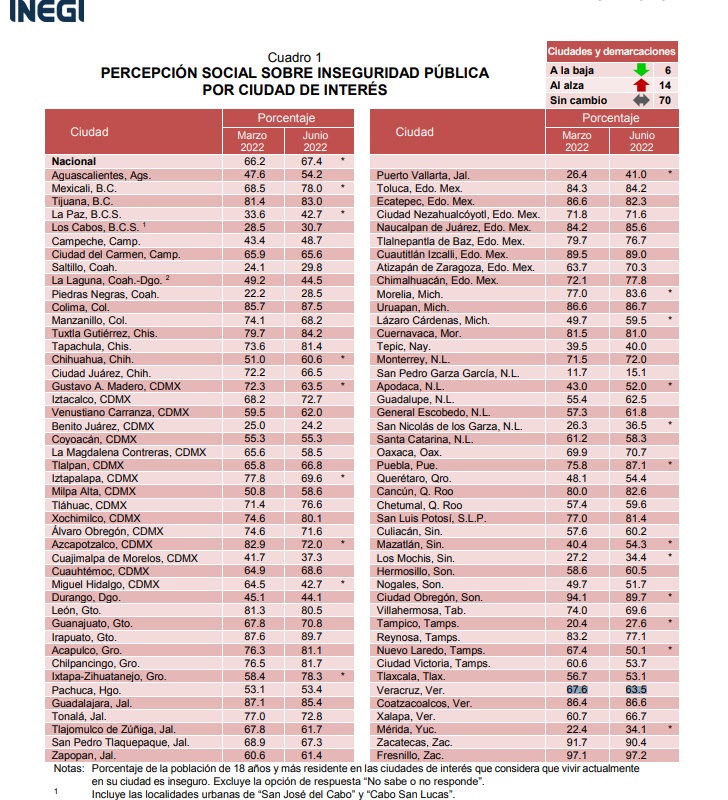 La Encuesta Nacional de Seguridad Pública Urbana del segundo trimestre del 2022 que mide a 75 ciudades medias en el país, reveló que Coatzacoalcos, Xalapa y Veracruz están entre los municipios con mayor percepción de inseguridad.
