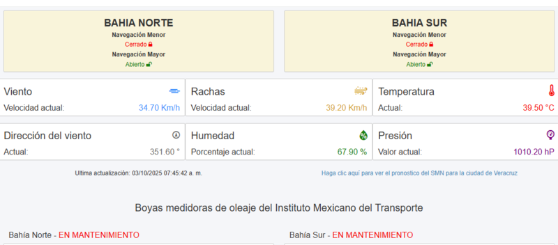 La Capitanía de Puerto de Veracruz informa que permanecen cerradas las bahías Norte y Sur a la navegación turística y de pesca este viernes, por un centro de baja presión sobre el suroeste del Golfo de México se ha convertido en una vaguada, ubicado sobre el suroeste del Golfo de México, que ocasionará viento del Noroeste y Norte con posibles rachas de 55 a 70 km/h en Veracruz. Para checar intensidad actual del viento dar clik aquí