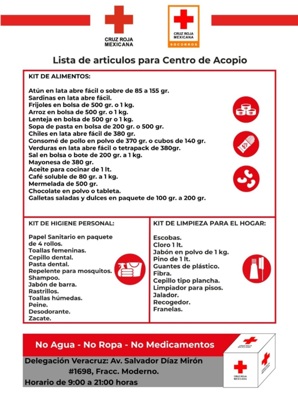 De acuerdo con la Cruz Roja, se requieren kits de alimentos, de higiene personal y de limpieza para el hogar con los siguientes prodcutos: