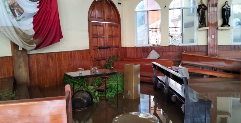 En las fotografías se aprecia la afectación que dejaron las inundaciones en un templo de la diócesis de Papantla.