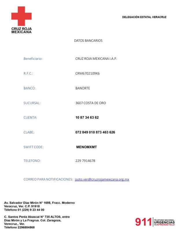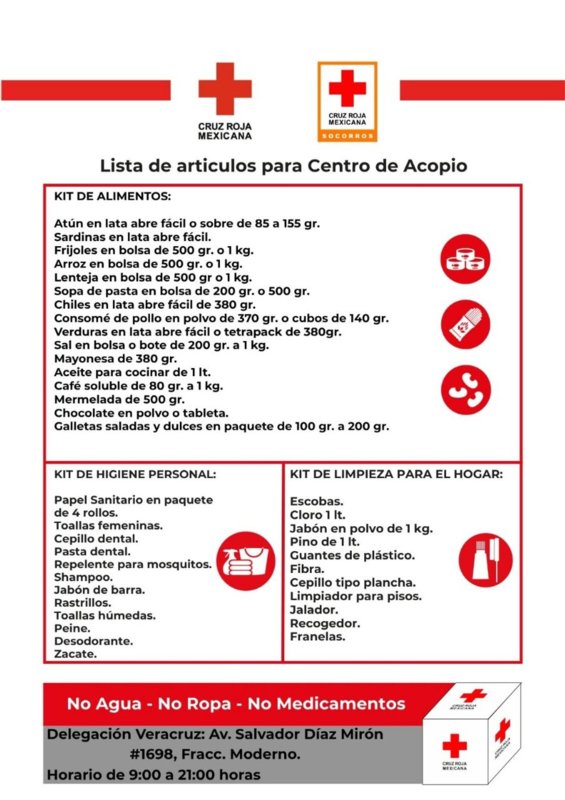 Los centros de acopio operan de 8:00 a 21:00 horas, y todas las delegaciones de la Cruz Roja están instruidas para recibir donativos y canalizarlos al punto de concentración en el puerto de Veracruz.