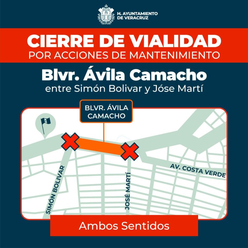 El Ayuntamiento de Veracruz, dio a conocer que el bulevar Manuel Ávila Camacho de Bolívar a Martí, permanecerá cerrado en ambos sentidos, por trabajos de mantenimiento.