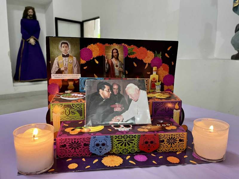 El altar también cuenta con los retratos del beato de Naolinco, el padre Ángel Darío Acosta Zurita y el Sagrado Corazón de Jesús.