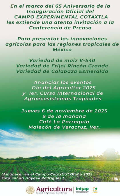 Este año se celebra 65 años de creación del Campo Experimental Cotaxtla, así como el Día del Agricultor, por lo que se realizarán diferentes eventos para conmemorar la fecha, comentó Francisco Ugalde, Investigador del Campo Experimental Cotaxtla.