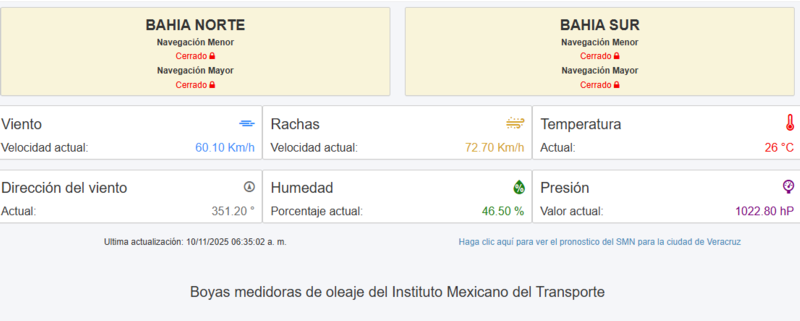 La Capitanía de Puerto de Veracruz informa que permanecen cerradas las bahías Norte y Sur a la navegación menor y mayor la mañana de este lunes 10 de noviembre por el evento de Norte y el paso del Frente frío 13 en Veracruz. Al momento se registran rachas de 87.8 km/h, que irán aumentando.