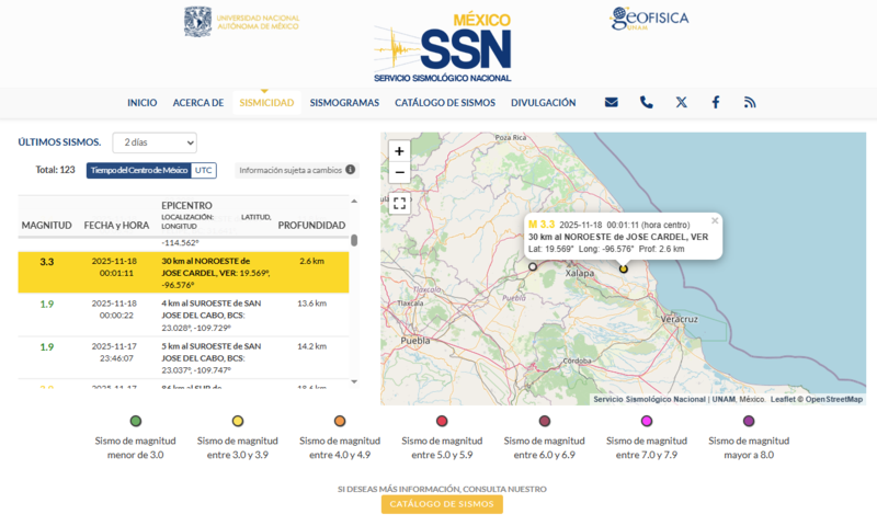 A través de su portal, el Sismológico Nacional reportó: “M 3.3 2025-11-18 00:01:11 (hora centro) 30 km al NOROESTE de JOSE CARDEL, VER Lat: 19.569° Long: -96.576° Prof: 2.6 km”.
