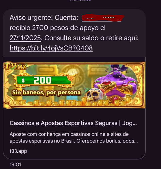 Sin embargo, estos son mensajes falsos, enviados posiblemente desde reclusorios por células delictivas. Los enlaces que envías redireccionan a páginas de supuestos casinos en línea, en donde solicitan datos bancarios para cobrar el supuesto pago.
