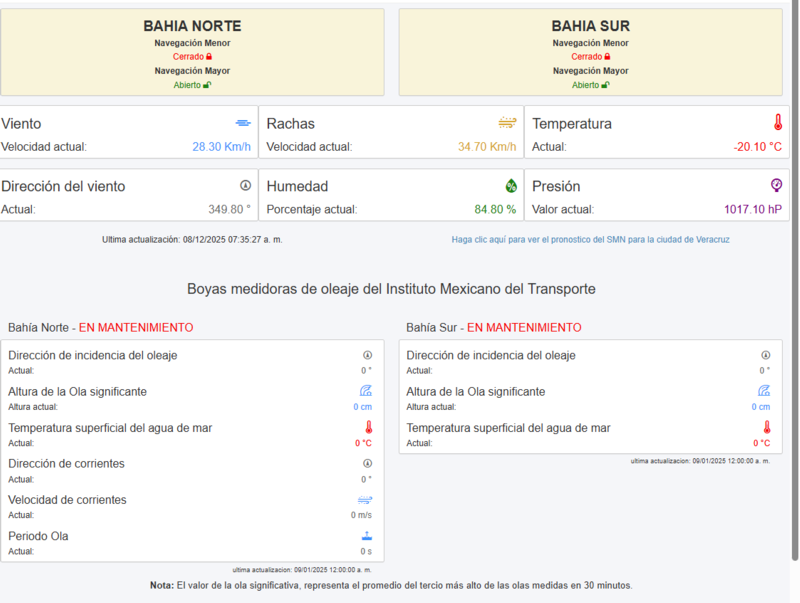 La Capitanía de Puerto de Veracruz informa que fueron cerradas las bahías Norte y Sur a la navegación turística y de pesca la mañana de este lunes, ante el paso de frente frío y evento de Norte con rachas de 85-100 km/h en la costa central (Veracruz-Boca del Río) este día. Para checar intensidad actual del viento dar click aquí