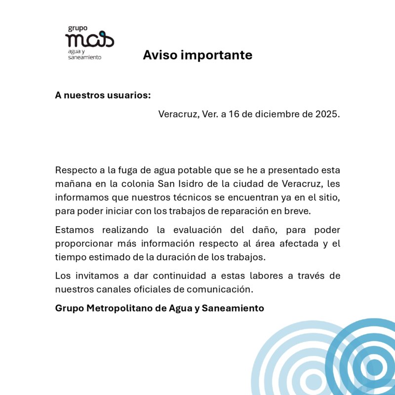 En redes sociales, la empresa señaló que los técnicos se encuentran ya en el sitio, para poder iniciar con los trabajos de reparación en breve.