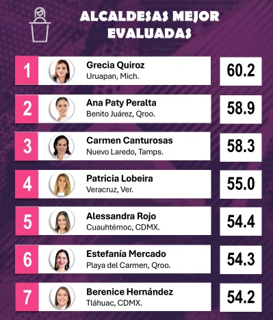 Patricia Lobeira sobresale junto con las y los alcaldes de municipios como Uruapan, Michoacán; Benito Juárez, Quintana Roo; Hermosillo, Sonora; y Nuevo Laredo, Tamaulipas; reflejando el respaldo ciudadano al trabajo realizado durante su gestión.