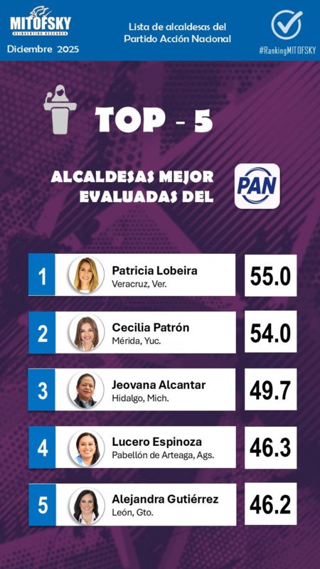 Asimismo, Paty Lobeira se mantiene con una destacada aprobación dentro del listado de alcaldes del Partido Acción Nacional (PAN), consolidándose como la alcaldesa mejor evaluada entre presidentas municipales de su partido a nivel nacional.