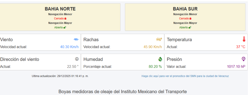 La Capitanía de Puerto de Veracruz informó que permanecen cerradas las bahías Norte y Sur a la navegación turística y de pesca la tarde de este lunes 29 de diciembre, ante el ingreso del frente frío 25 en costas de Veracruz-Boca del Río.