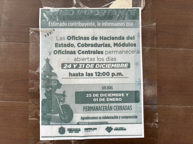 ¿Cuáles serán los horarios durante días festivos la Oficina de Hacienda del Estado en Veracruz?