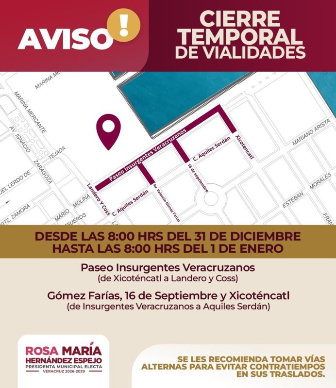 La Administración municipal informó que habrá cierre de vialidades por actividades de fin de año en la zona centro de la ciudad de Veracruz este miércoles 31 de diciembre y jueves 1 de enero de 2026.