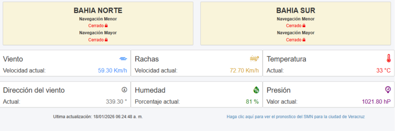 Durante la mañana de este domingo, la zona portuaria de Veracruz continúa cerrada a la navegación mayor y menor en sus dos bahías de atraque, dejando decenas de barcos sin poder salir ni llegar al puerto.