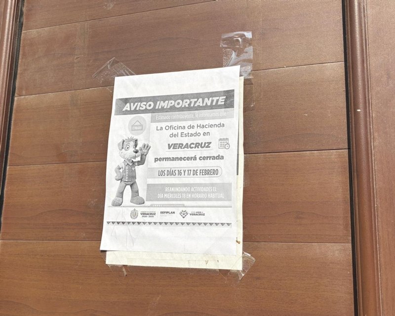 "Aviso importante, estimado contribuyente, le informamos que la Oficina de Hacienda del Estado en Veracruz permanecerá cerrada los días 16 y 17 de febrero. Reanudando actividades el día miércoles 18 de febrero en el horario habitual", se lee en un documento pegado en puertas y ventanas.