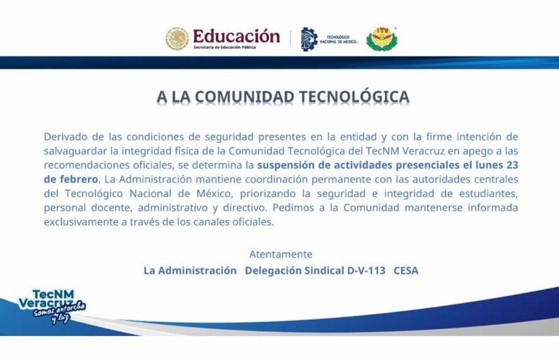 La administración del Tecnológico Nacional de México campus TecNM Veracruz informó a la comunidad tecnológica la suspensión de actividades presenciales programadas para el lunes 23 de febrero.