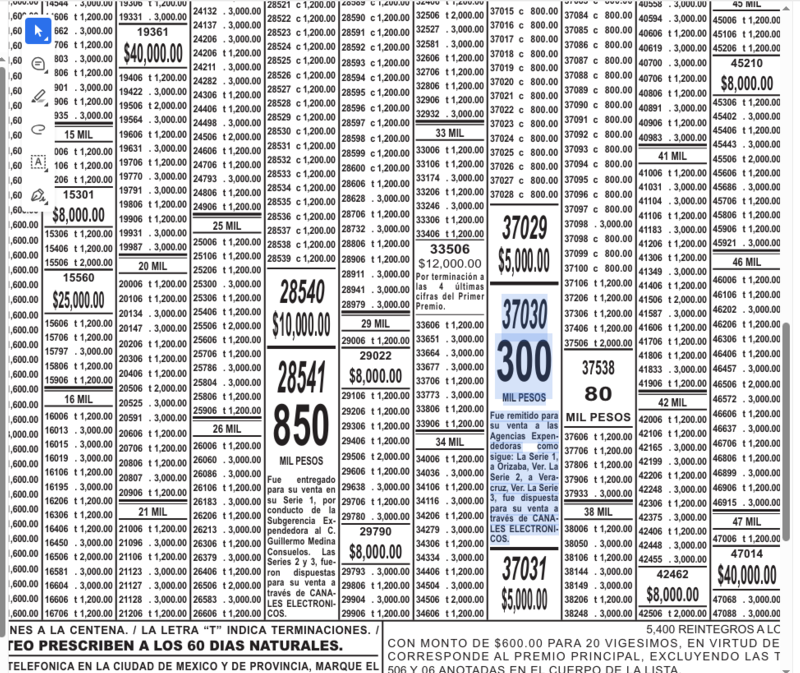 "El boleto 37030 obtuvo 300 MIL PESOS tras ser remitido para su venta a las Agencias Expendedoras “como sigue: La Serie 1, a Orizaba, Ver. La Serie 2, a Veracruz, Ver. La Serie 3, fue dispuesta para su venta a través de CANALES ELECTRONICOS”.