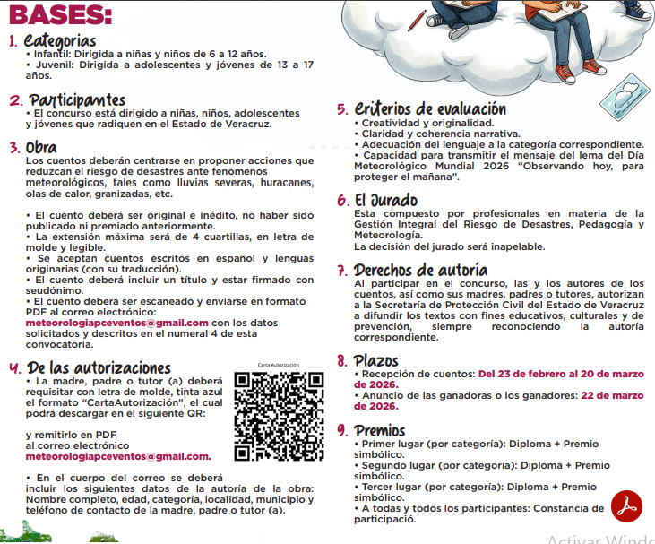 La Secretaría de Protección Civil del estado de Veracruz convocan a los concursos de cuento juvenil e infantil, así como el concurso de fotografía, en el marco del Día mundial del Agua y del Meteorológico Mundial, que se conmemoran el 23 de marzo.