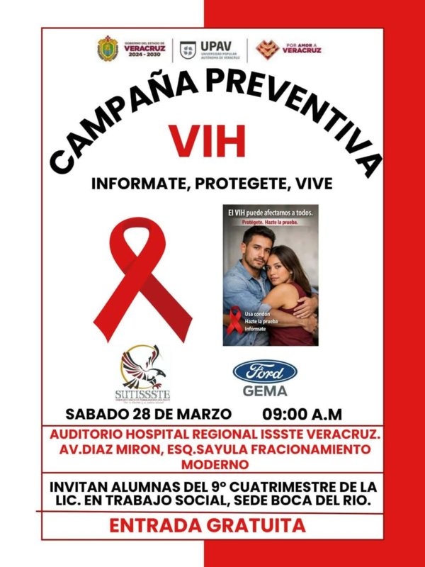 El próximo 28 de marzo realizarán una campaña preventiva de VIH en las instalaciones del Hospital Regional del ISSSTE de Veracruz ubicado en la avenida Díaz Mirón.