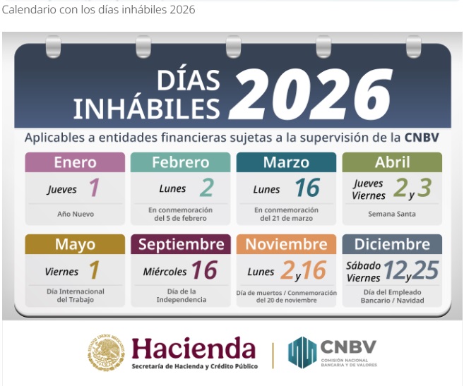 La Comisión Nacional Bancaria y de Valores tiene establecidos los  días inhábiles durante el 2026, de las entidades financieras sujetas a su supervisión.