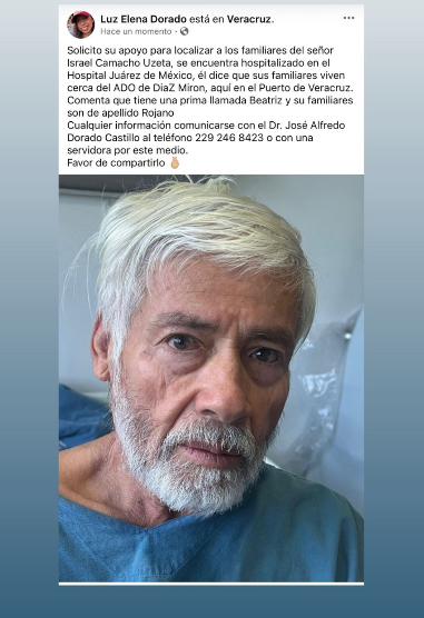 Buscan a familiares de un veracruzano hospitalizado en la Ciudad de México, se trata del adulto mayor Israel Camacho Uzeta, quien permanece internado en el hospital Juárez de la Ciudad de México.